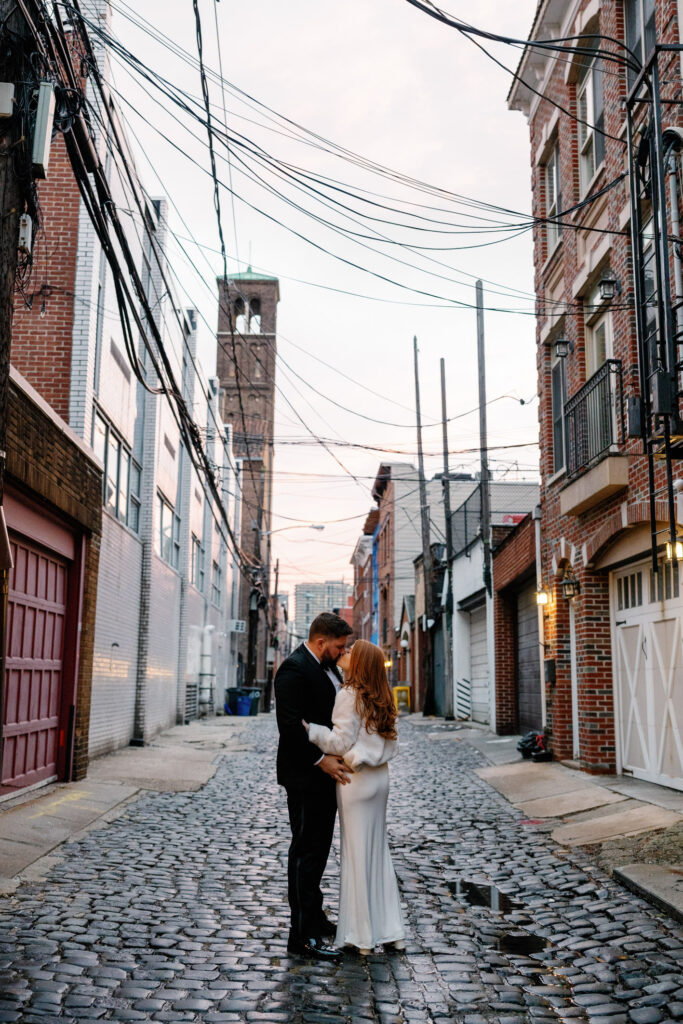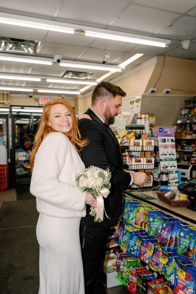Afterward, we stepped back outside for more photos in front of the courthouse, then made our way toward the city line. Hoboken’s streets and skyline gave us the perfect mix of urban charm and movement, letting the celebration continue naturally. Somewhere between portraits and dinner plans, they made a quick stop at 7-Eleven—one of those perfectly unplanned moments that made the day feel real and very them.